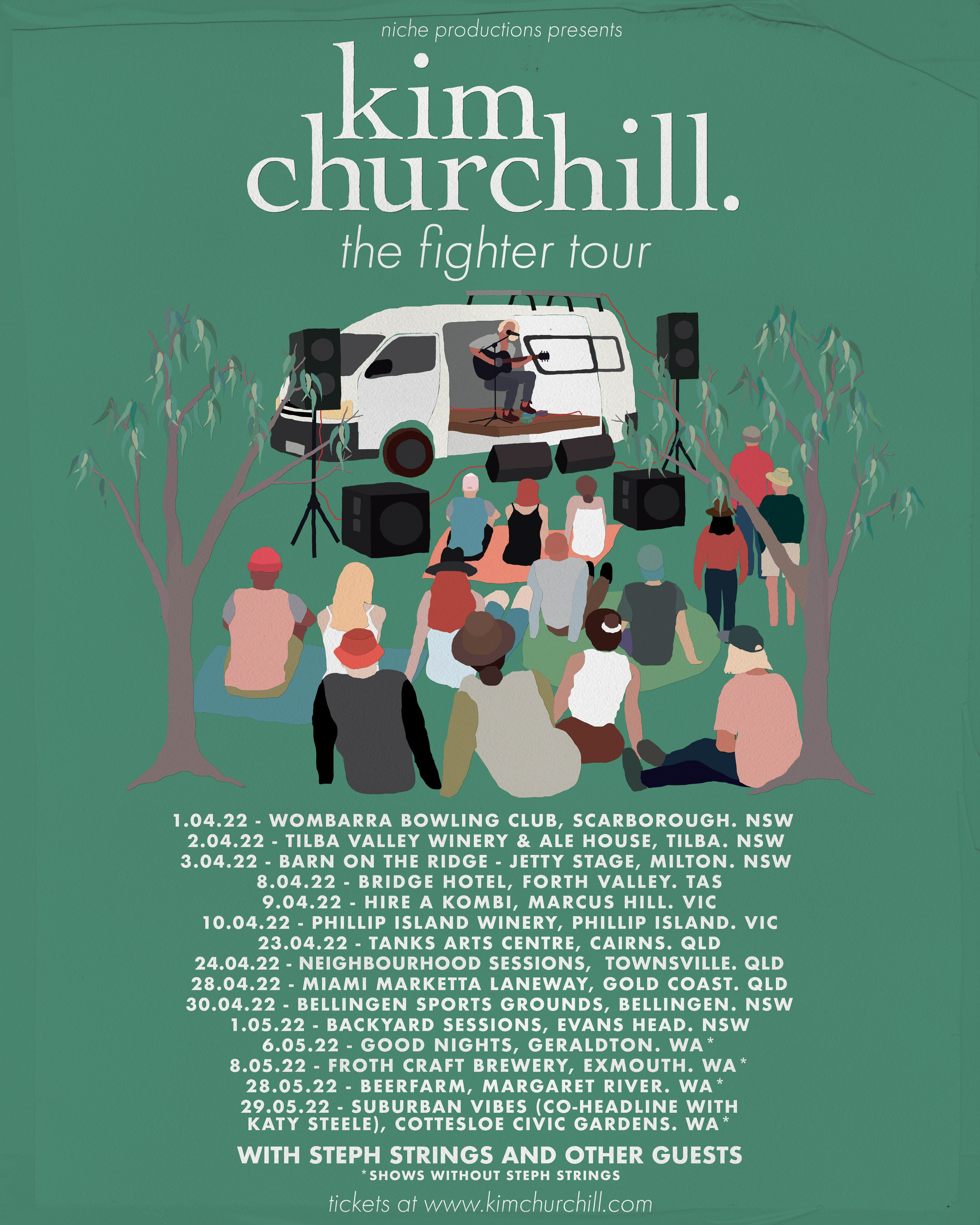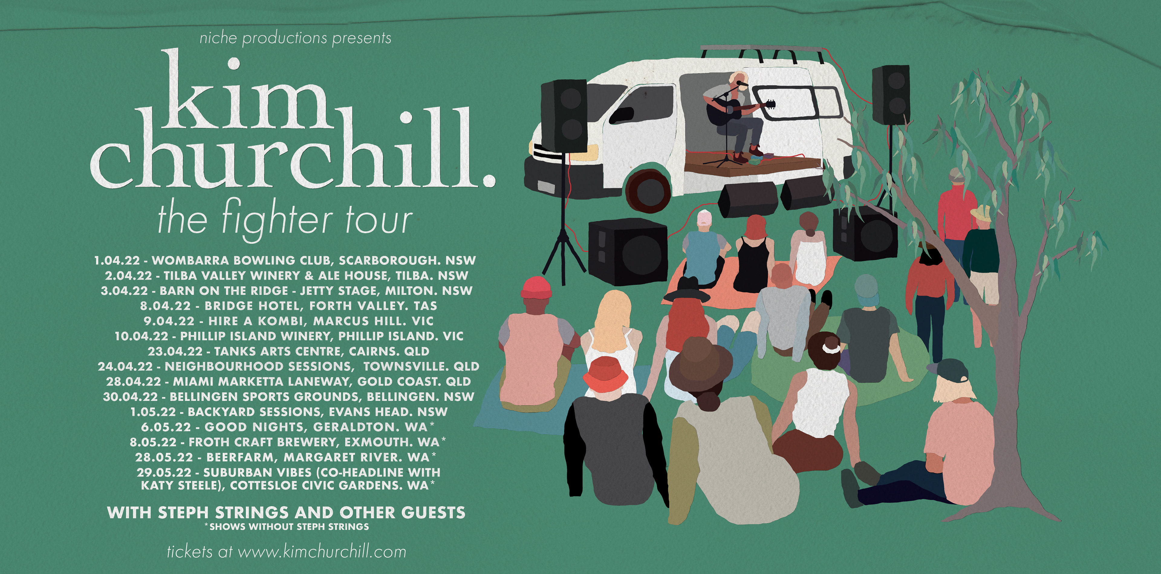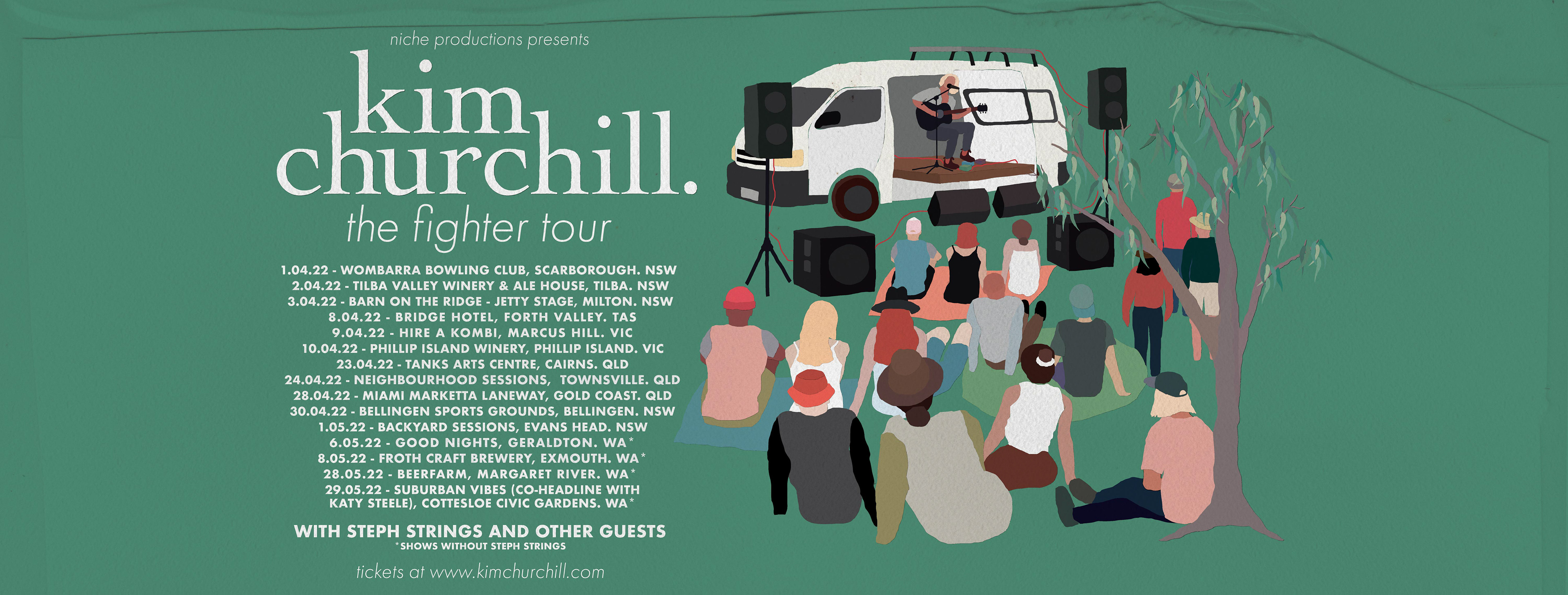 VISUAL IDENTITY CREATION, ILLUSTRATION, DIGITAL ASSETS AND PRINT DESIGN FOR KIM CHURCHILL'S FIGHTER TOUR PLUS 'SUBURBAN VIBES' GIG.