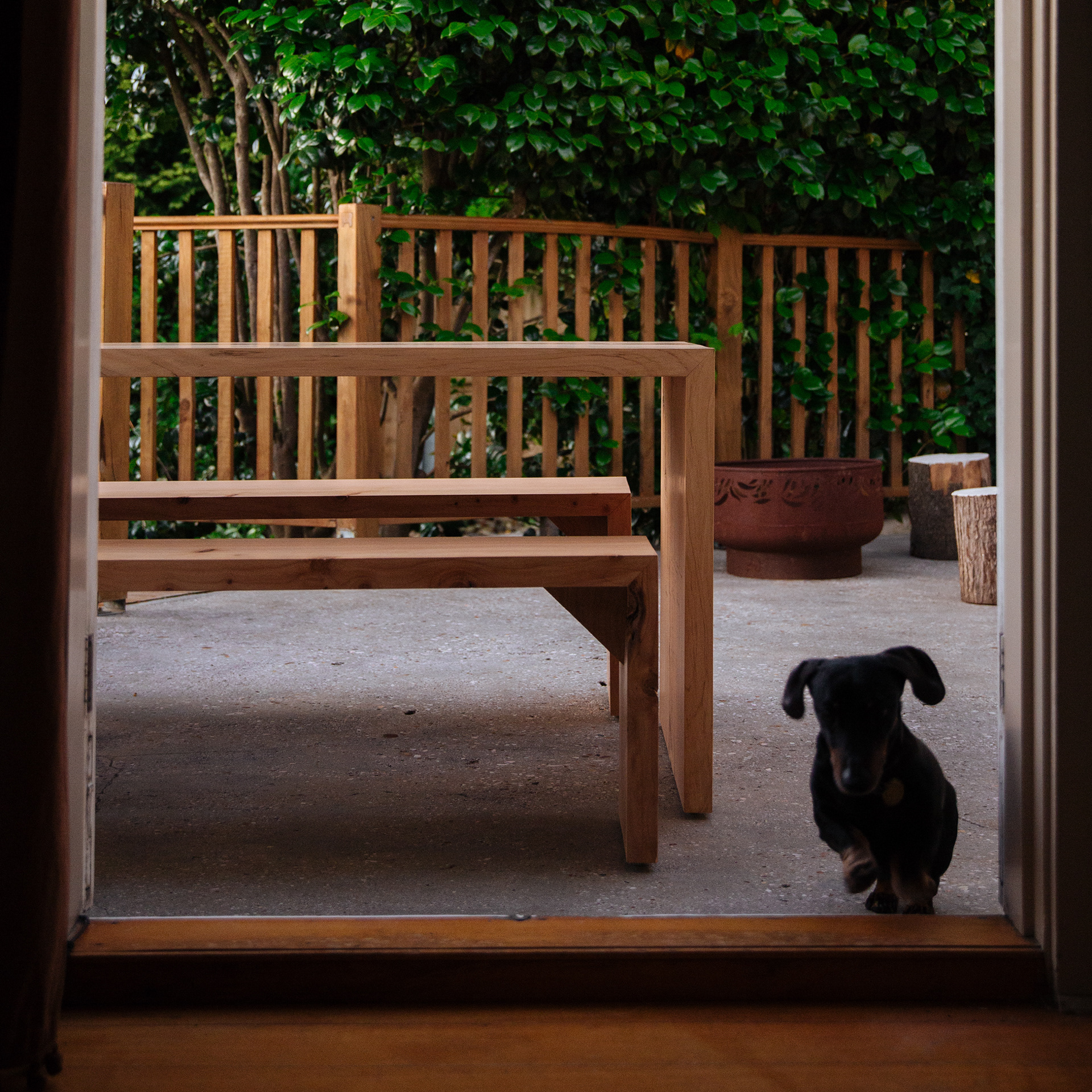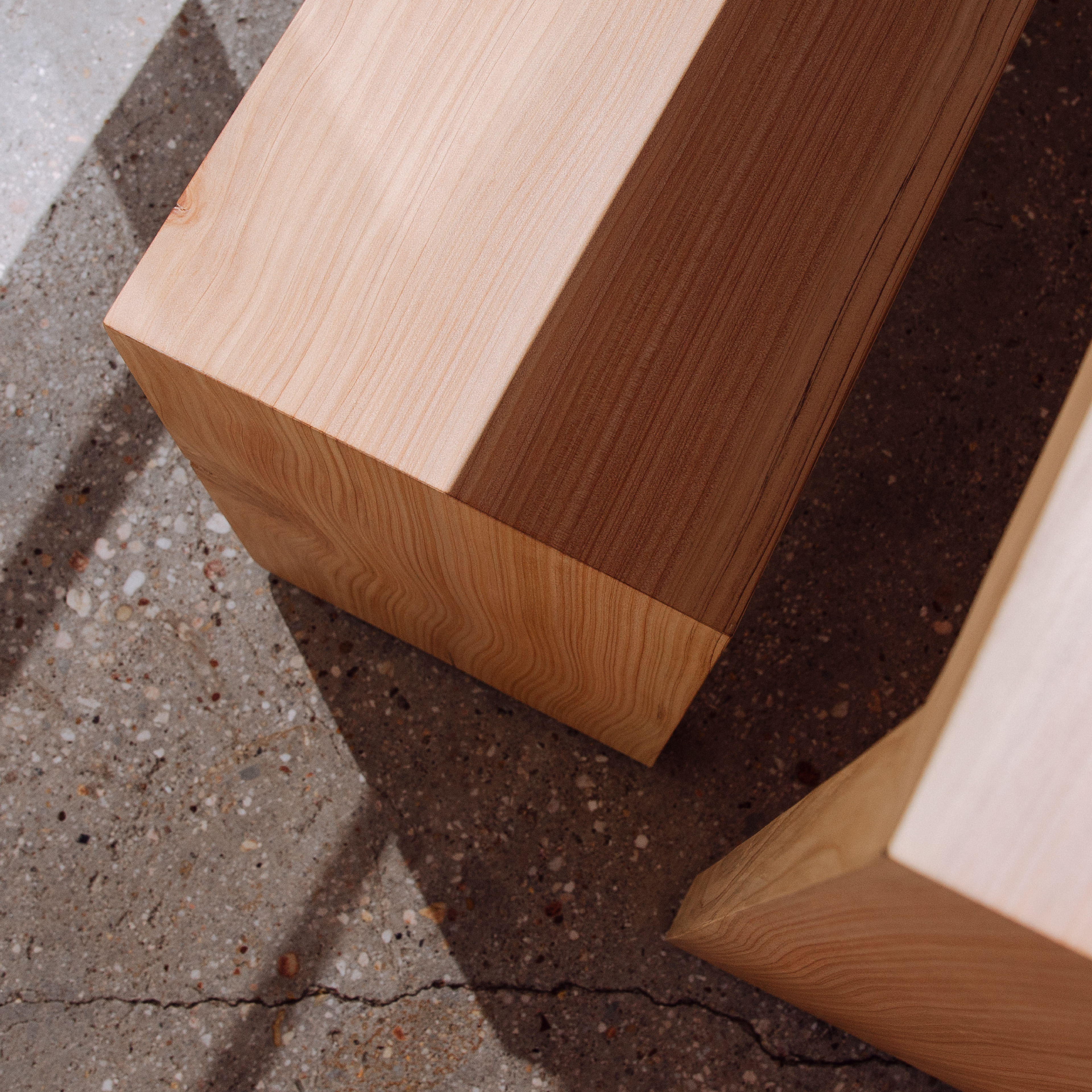 CONSTRUCTED WITH DOWELED MITRE JOINTS, RECYCLED STEEL FOOT (GIVES A MAGICAL HOVERING LOOK WHILE KEEPING THE TIMBER AWAY FROM THE GROUNDS MOISTURE), FINISHED IN OSMO DECKING OIL.