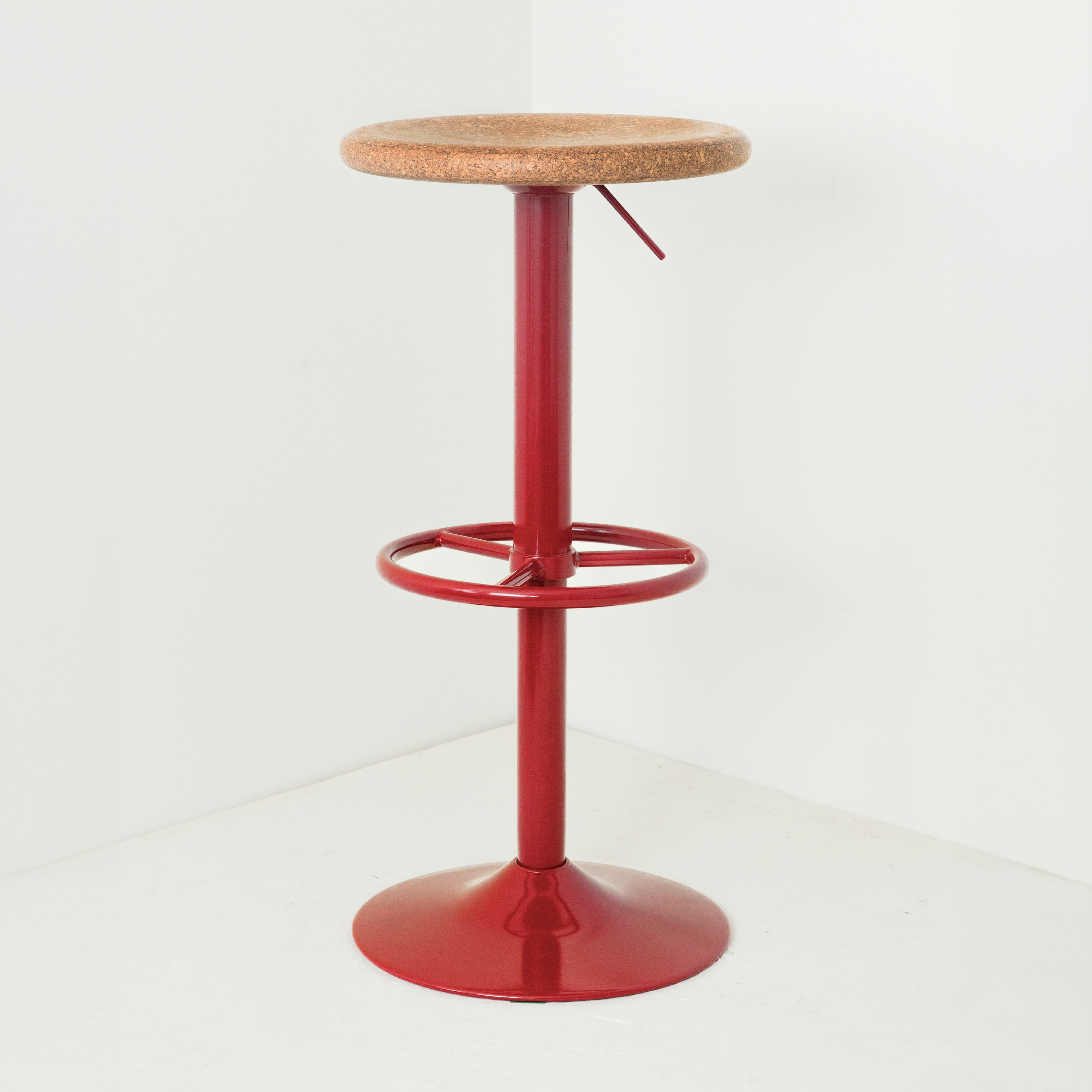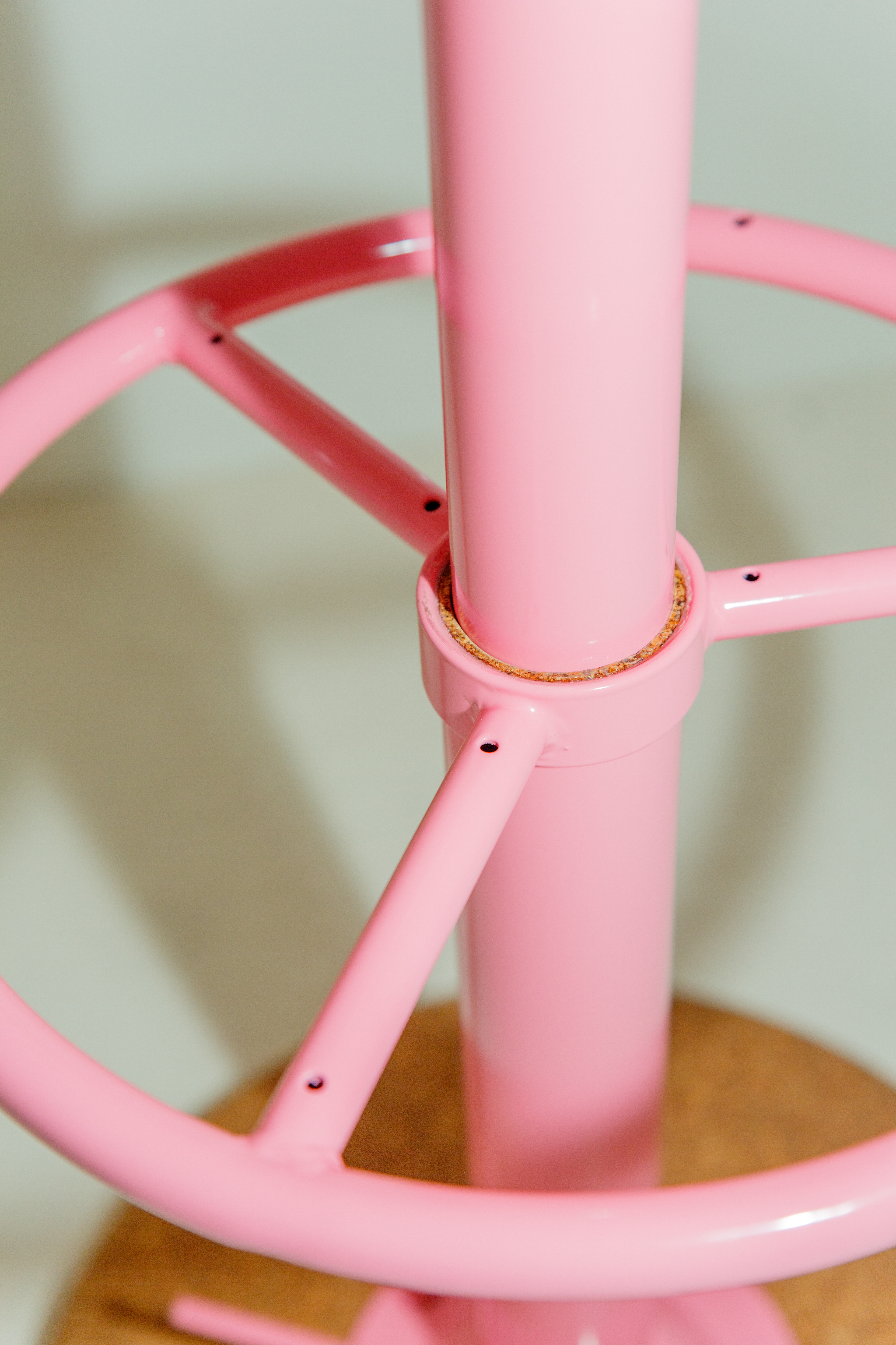 These steel bases are fairly common and also commonly discarded or for sale cheap when the poor quality upholstery fails. The system involves tidying up the frame to improve its function/detailing and then getting it powder coated, adding a beautiful and durable fishing. The failed upholstery is replaced with a hand shaped cork seat with a timber core (2x old st pats ply locker doors)